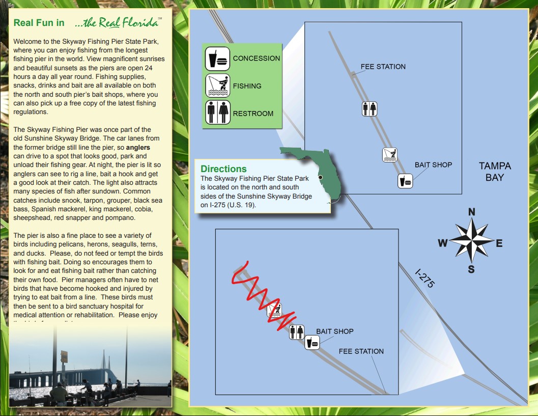 | bridge fishing pier state park, open 24/365: floridastateparks.org: skyway fishing pier state park. site about the fishing pier skywaypiers.proboards.com: discussion forum regarding the skyway piers. yelp.com: pier reviewed. 10.24.25: skyway fishing pier to be cut down in size. 07.07.11: old skyway fishing pier to get new life as artificial reef. 08.22.08: eastern skyway piers to close, structures' safety a concern. 09.27.02: skyway fishing piers state park unit management plan 11/2014: world's longest fishing pier brochure. the pier is the longest. the brochure itself is a standard sized brochure that one might expect.