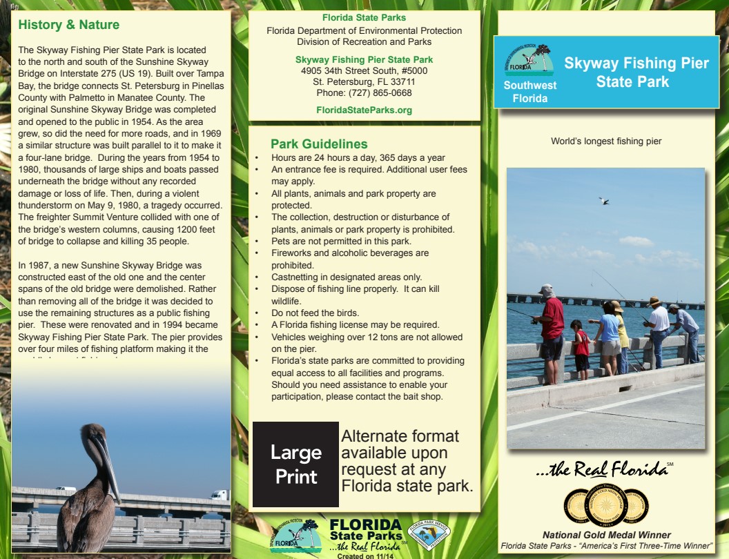 | bridge fishing pier state park, open 24/365: floridastateparks.org: skyway fishing pier state park. site about the fishing pier skywaypiers.proboards.com: discussion forum regarding the skyway piers. yelp.com: pier reviewed. 10.24.25: skyway fishing pier to be cut down in size. 07.07.11: old skyway fishing pier to get new life as artificial reef. 08.22.08: eastern skyway piers to close, structures' safety a concern. 09.27.02: skyway fishing piers state park unit management plan 11/2014: world's longest fishing pier brochure. the pier is the longest. the brochure itself is a standard sized brochure that one might expect.